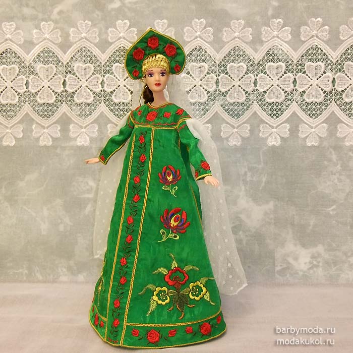 из золотой тесьмы с бахромой. К нему пришит платок из сетки. Сверху одет кокошник. Кокошник завязывается золотым шнурком сзади.