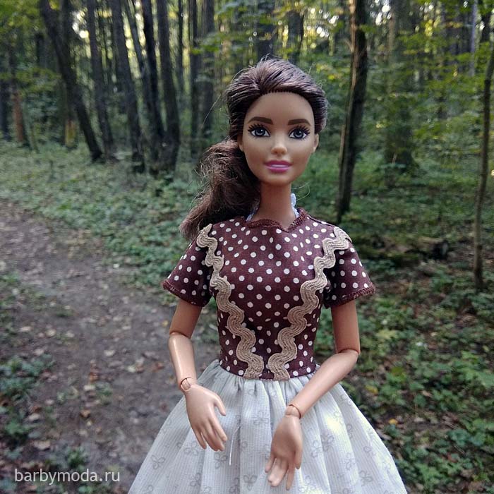 Для нее сшито летнее платье из хлопчатобумажной ткани двух расцветок в горошек и с цветочным рисунком.