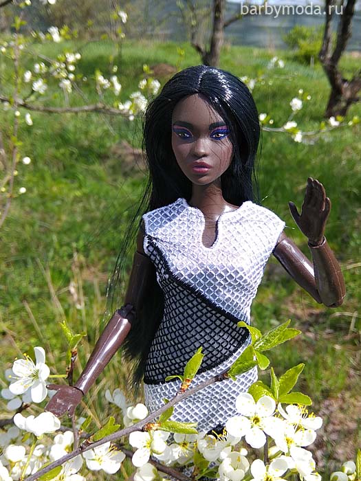 Платье для высокой барби сшито из светло-серого атласа, дизайн разработан в программе Вилком (Wilcom) с заполнением полотна платья мотивной вышивкой.