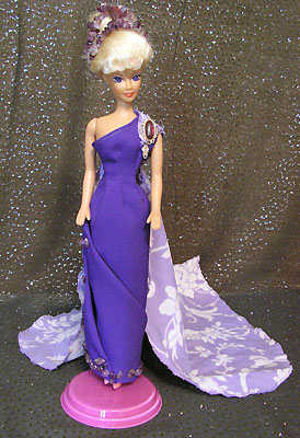 На принцессе длинное платье лилового цвета. Одно плечо открыто.