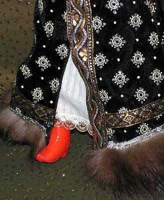 Отдельно одевается воротник из золотого ламе, богато расшитый тесьмой и блестками-бусинками, сзади застегивается на пуговицу.