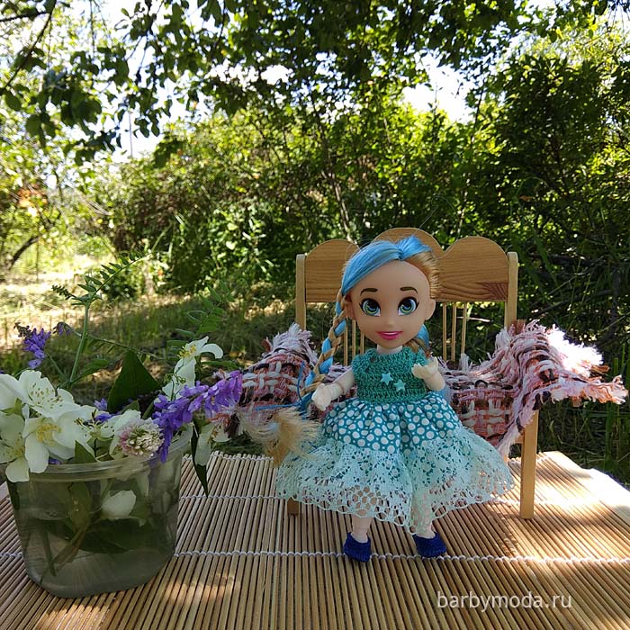 Для нее сшито платье с вязаным крючком из акриловых ниток лифом, украшеное рюшем из нежных кружев.