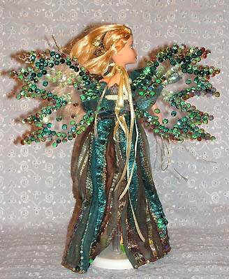 У Феи изящные крылышки. Основа крылышек вырезана из пластиковой пленки. С одно стороны крыльев пришиты пайетки, с другой стороны пайетки наклеены. Крылышки крепятся с помощью атласной ленты.