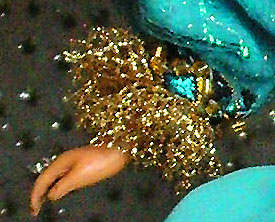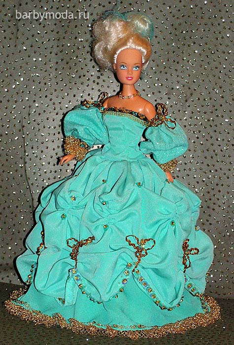 Пышные двойные рукава (верх - легкая бирюзовая сеточка) сшиты отдельно от платья, снизу и сверху отделаны тесьмой, расшитой бисером, снизу рукава - рюш из золотистой сетки.
