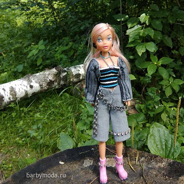 Сверху - короткая кофточка из серого трикотажа с расширяющимися книзу рукавами.