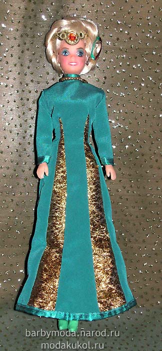Длинное строгое платье цвета морской волны с клиновидными вставками из золотой парчи.
