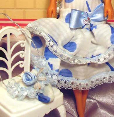 Внизу платья пришиты две оборки, украшенные голубым кружевом, а также нашит сверху пояс, украшенный бантом из атласной ленты и бусинкой из чешского стекла.