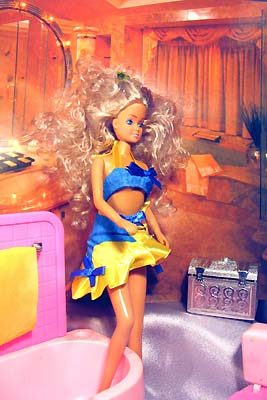 Купальник раздельный сшит из хлопчатобумажной ткани. Верх и низ купальника сшит из двух слоёв ткани, завязываются с помощью атласных ленточек. Отделка - бантики.