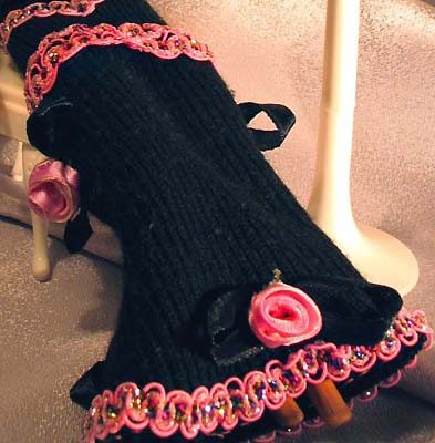 Шляпка из кусочка чёрного кружева (собрано по краю) украшена розовыми розами и чёрными лентами. Завязывается чёрными ленточками.