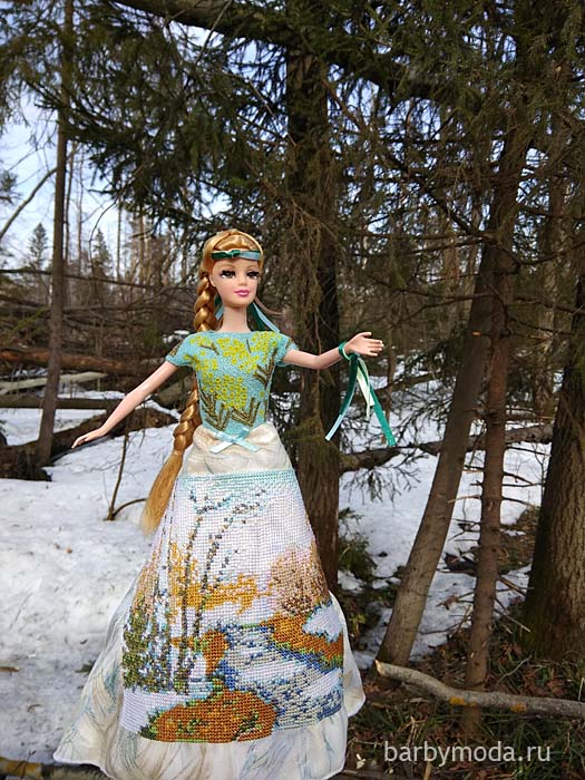Для юбки была оцифрована и переведена в крестик картинка ранней весны в программе Pattern Maker, затем вышита на вышивальной машине.