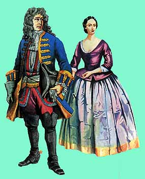 Офицер с дамой, 1720 г. Иллюстрированная энциклопедия. История костюма и моды. Джек Кэссин-Скотт. Источник иллюстрации - Европейские источники той эпохи и Temple Newsom House, Лидс Туалет дамы состоит из казакина и юбки. Лиф дублета или казакина плотно облегает фигуру до талии, а сильно расширенные фалды опускаются на юбку. Лиф застегивался спереди до талии с помощью крючков и петель, скрытых специальной складкой. Рукава длиной чуть ниже локтя были узкими; из-под них выступали плиссированные манжеты рукавов рубашки. Гладкая юбка надевалась на колоколообразную конструкцию из металлических обручей.