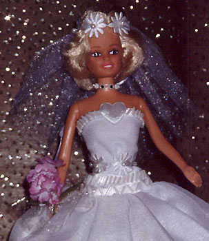 Пышная полупрозрачная верхняя юбка по низу украшена кружевным шитьем и расшита белым стеклярусом. Нижняя юбка из набивного шелка. Лиф отделан атласной бейкой и по линии талии атласными цветами с жемчужными бусинками посередине. Лиф также расшит стеклярусом. Сверху на лифе атласное сердечко. Из таких же цветов венок на короткой двойной фате. В руках нежный букет.