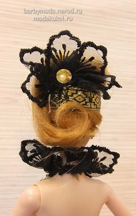 Прическу украшает головной убор-повязка с отделкой из черных кружев.