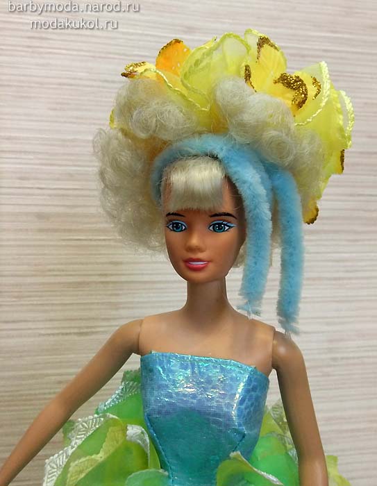 На голове шляпка из желтых капроновых рюшей с позолоченными цветами.