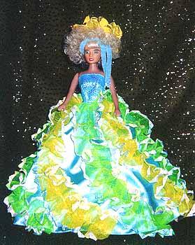 Платье расшито спирально спускающимися капроновыми рюшами желтого и зеленого цвета.