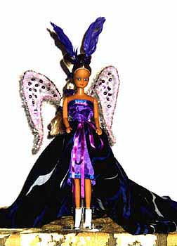 Для создания облика выбрана кукла Стеффи.Сиреневое шелковое платье отделано атласными лентами. Длинная пышная юбка-шлейф с нежными крыльями завязывается атласной лентой. Завершают облик лиловые перья в прическе.