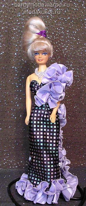 Платье, в котором продавалась кукла, дополнительно отделано сиреневыми рюшами и крупными пуговицами по бокам и сзади.