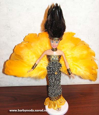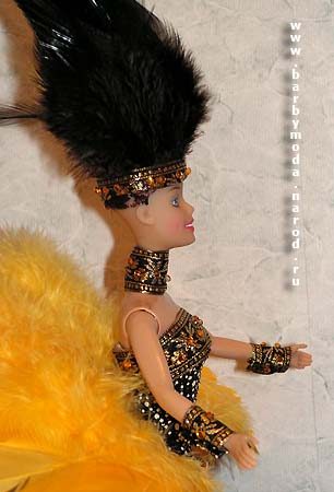 Хвост сделан из желтых перьев, наклеенных на заготовку из картона, по заготовке сзади пришиты два слоя рюшей из желтого капронового кружева. Хвост крепиться пояском из трикотажа, как на платье и закалывается сзади заколкой с пестрым перышком в тон платью. Спереди пояс украшен брошкой с крупным желтым стразом.