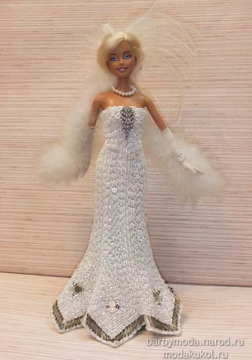 Длинное платье с юбкой-шестиклинкой полностью расшито белым блестящим бисером и стеклярусом.