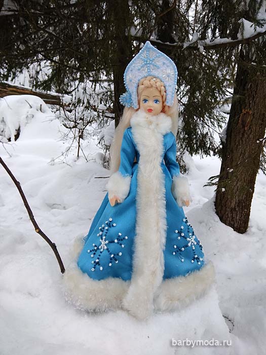 На голове расшитая бисером и стеклярусом снежная корона.