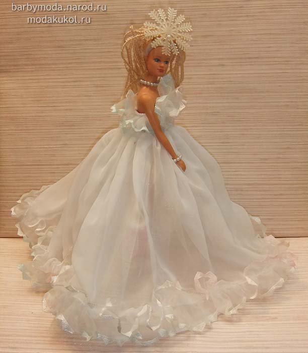 Для нее сшито длинное открытое воздушное белое платье с отделкой из пены рюшей с переходящими нежными цветами.