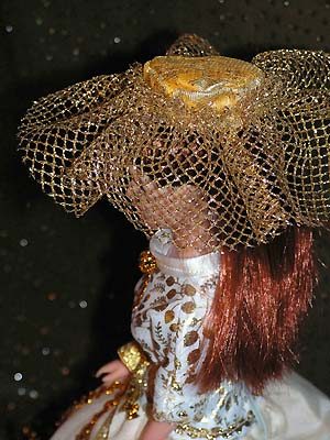 Пышное бальное платье. Лиф из белого ламе с золотым рисунком, цельнокроеный, рукава отделаны кружевом с золотом, горловина - белой косой бейкой, украшена золотым сердечком. По низу лиф отделан золотой тесьмой-змейкой. Сзади платье застегивается на молнию.