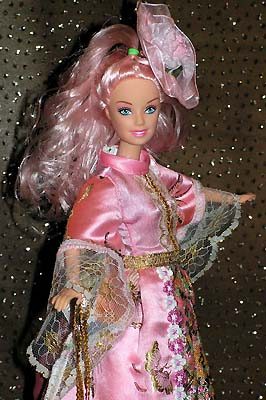 Юбка из атласа с разноцветными бабочками, со вставкой из парчи, отделана тесьмой, кружевом с золотом и золотой лентой. Нижняя юбка из фатина.