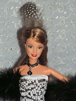 На Барби длинное вечернее платье из жатого трикотажа с юбкой-оборкой из белой плотной ткани с рисунком с крупными черными розами.