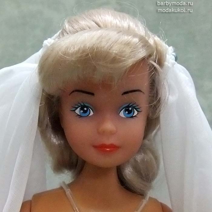 Для создания образа выбрана кукла Белинда. Открытое полупрозрачное прямое платье полностью расшито матовым стеклярусом. Длинные волосы собраны в прическу. С головы фалдами спадает белое полупрозрачное шифоновое покрывало.