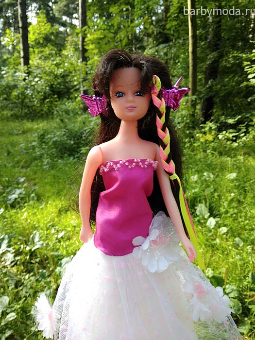 Венди-брюнетка одета в романтичное платье из малинового шелка с юбкой из фатина, украшенной крупными нежными цветами.