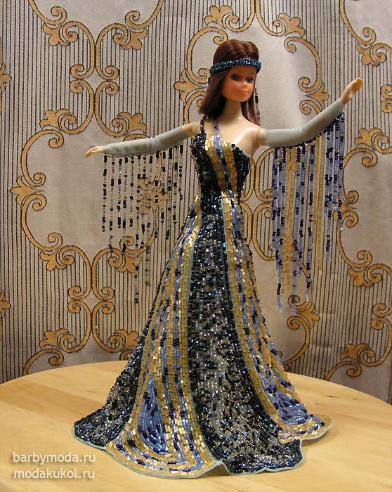 Длинное платье с юбкой-шестиклинкой-годе полностью расшито бисером, как бы стекая вниз.