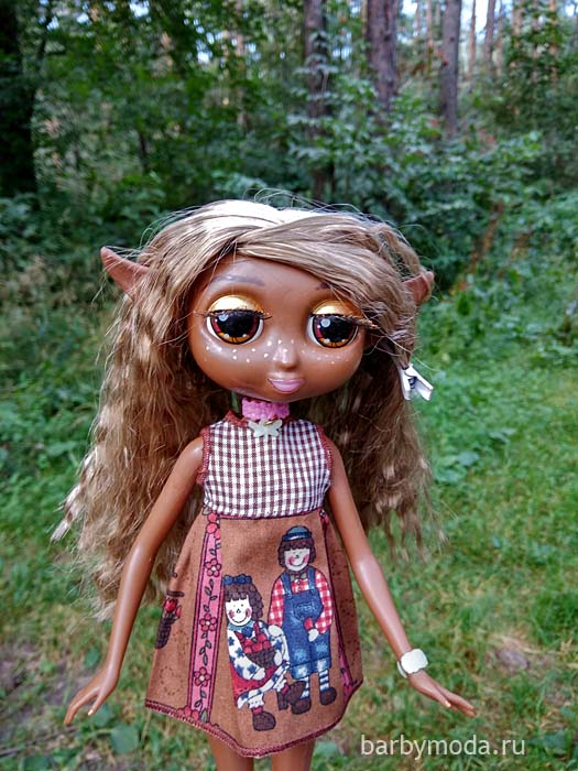 Для Тиа слеплены эльфийские ушки из запекаемой глины. С помощью матового лака немного убран блеск на личике, тени перекрашены золотой краской, добавлены веснушки и позолочены кончики ресниц.