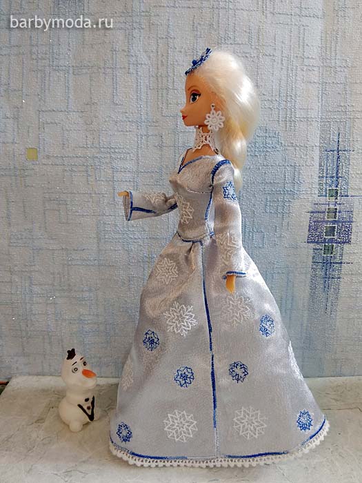 На голове корона из вышитого кружева, серьги и ожерелье тоже из вышитых снежинок.