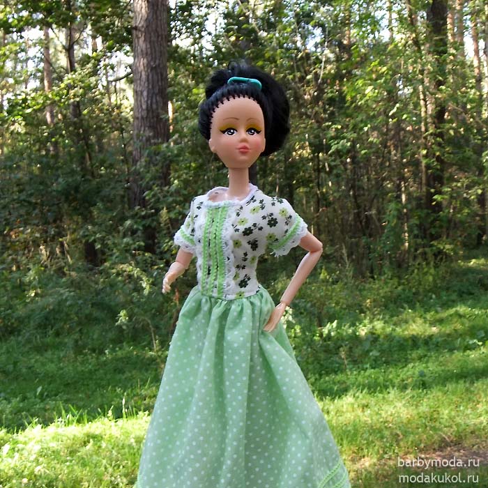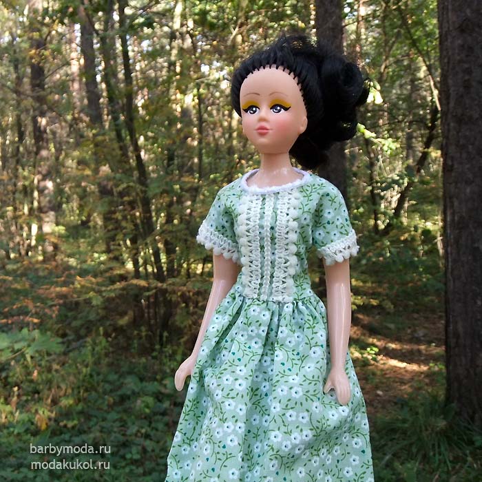 Для нее сшито вечернее платье из жаккардовой ткани, отделанное кружевом.