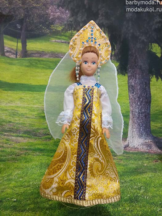 Сарафан и кокошник сшиты из парчи, сарафан украшен по центру жаккардовой тесьмой, отделан по верху и низу гофрированной золотой лентой.