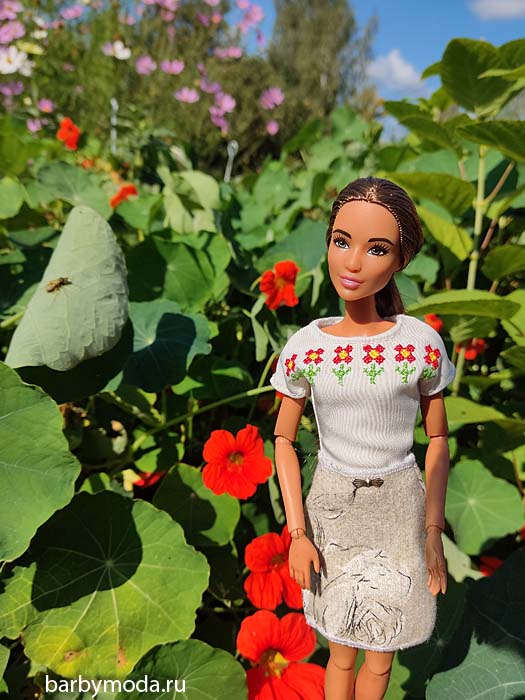 Платье для стандартной Барби сшито из атласа, дизайн платья разработан в программе Вилком (Wilcom) с заполнением полотна платья разной мотивной вышивкой и добавлением переработанных цветочных дизайнов.