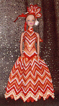 Открытое длинное платье из оригинальной ткани с зигзагообразным рисунком с воротником-стойкой, застегивающимся сзади.