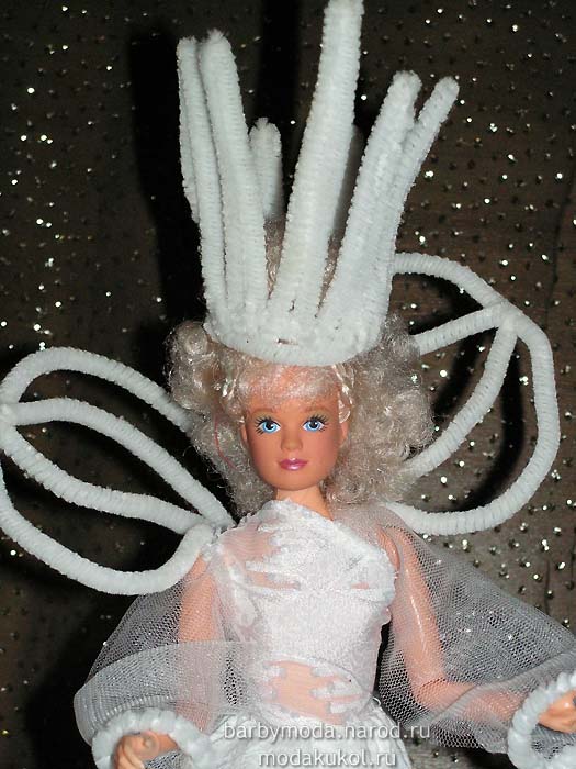 Низ юбки отделан проволочной бахромой и уложен фалдами.