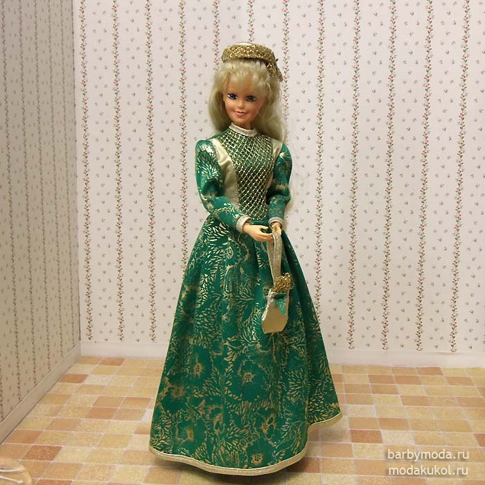 Длинное платье из зеленого трикотажа (ламе) с золотым рисунком.